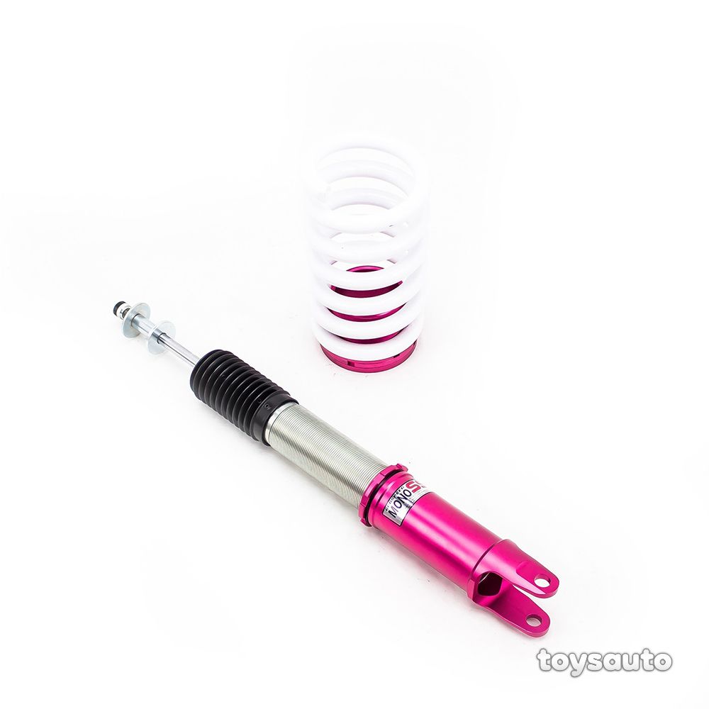 Godspeed Project's MonoSS is our one entity in our family of single-adjustable coilover suspension kits. These coilovers are designed to be a streetable race built coilover at an affordable price. It features a monotube damper that is made out of a carbon seamless steel 52mm tube with a performance internal piston providing maximum damper response. The cold-bent springs are made from high strength SAE9252 steel to optimize the balance between performance and comfort. Using race quality shock oil, Godspeed Project can guarantee exceptional damper performance at any temperature on and off the track. The top of the shock is attached to the car using a high quality top hat that features a high performance Japanese KOYO 6204Z bearing pillow ball mount (when applicable). The bottom shock brackets are made out of a T7075 forged aluminum or carbon steel brackets for lighter weight without sacrificing durability which also includes brake line brackets (when applicable). The MonoSS offers 16 level of damper adjustability which can be set to your preference.