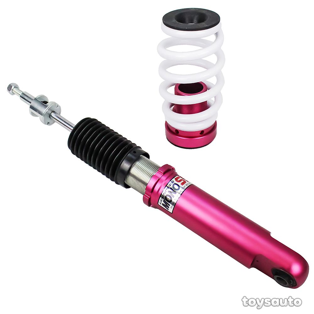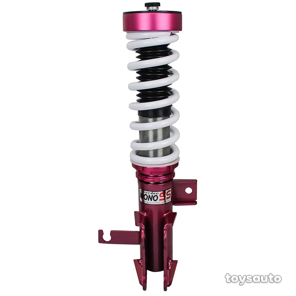 Godspeed Project's MonoSS is our one entity in our family of single-adjustable coilover suspension kits. These coilovers are designed to be a streetable race built coilover at an affordable price. It features a monotube damper that is made out of a carbon seamless steel 52mm tube with a performance internal piston providing maximum damper response. The cold-bent springs are made from high strength SAE9252 steel to optimize the balance between performance and comfort. Using race quality shock oil, Godspeed Project can guarantee exceptional damper performance at any temperature on and off the track. The top of the shock is attached to the car using a high quality top hat that features a high performance Japanese KOYO 6204Z bearing pillow ball mount (when applicable). The bottom shock brackets are made out of a T7075 forged aluminum or carbon steel brackets for lighter weight without sacrificing durability which also includes brake line brackets (when applicable). The MonoSS offers 16 level of damper adjustability which can be set to your preference.
