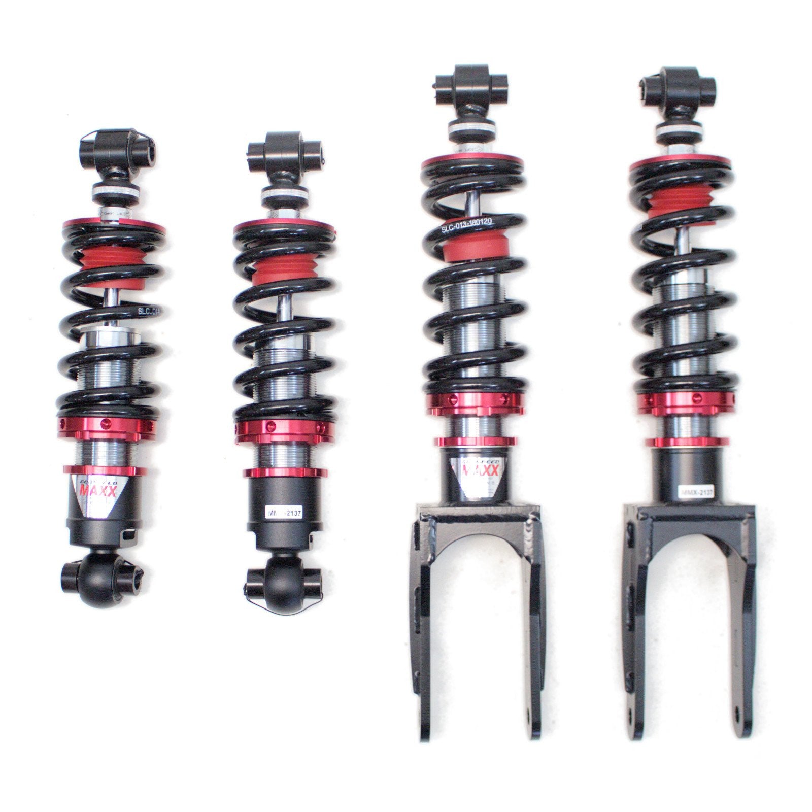 Godspeed Project's MAXX is our premier single-adjustable coilover suspension kit. These coilovers are designed to be a streetable race built coilover at an affordable price. It features a monotube damper that is made out of a carbon seamless steel 52mm tube with a 44mm internal piston providing maximum damper response. The cold-bent springs are made from high strength SAE9252 steel to optimize the balance between performance and comfort. Using high quality shock oil made in Italy, Godspeed Project can guarantee exceptional damper performance at any temperature on and off the track. The top of the shock is attached to the car using a high quality top hat that features a high performance bearing pillow ball mount (when applicable). The bottom shock brackets are made out of a T7075 forged aluminum or carbon steel brackets for lighter weight without sacrificing durability which also includes brake line brackets (when applicable). The MAXX offers 40 level of damper adjustability which can be set to your preference.