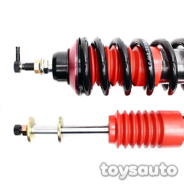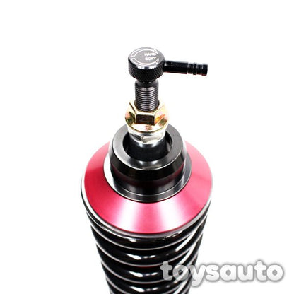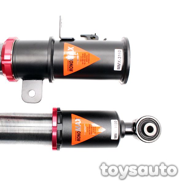 Godspeed Project's MAXX is our premier single-adjustable coilover suspension kit. These coilovers are designed to be a streetable track built coilover at an affordable price. It features a Mono-Tube shock that is made out of a carbon seamless steel 52mm tube with a 44mm internal piston providing maximum dampening response. The cold-bent springs are made from high strength SAE9252 steel to optimize the balance between performance and comfort. Using high quality shock oil made in Italy, we can guarantee efficient shock absorbing action at any ambient temperature on and off the track. The top of the shock is attached to the car using a high quality top hat that features a high performance bearing pillow ball mount (when applicable). For the bottom of the car, the shock brackets are made out of a T7075 forged aluminum for lighter weight without sacrificing durability which also includes brake line brackets (when applicable). The MAXX offers 40 level of dampening adjustability which can be set to your liking.