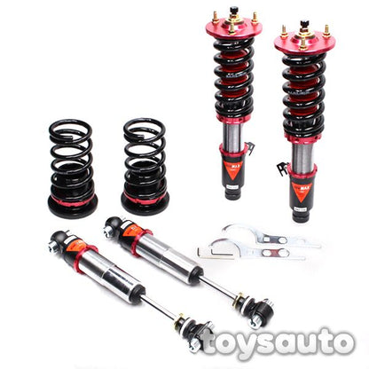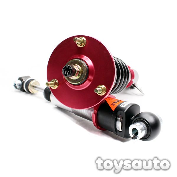 Godspeed Project's MAXX is our premier single-adjustable coilover suspension kit. These coilovers are designed to be a streetable race built coilover at an affordable price. It features a monotube damper that is made out of a carbon seamless steel 52mm tube with a 44mm internal piston providing maximum damper response. The cold-bent springs are made from high strength SAE9252 steel to optimize the balance between performance and comfort. Using high quality shock oil made in Italy, Godspeed Project can guarantee exceptional damper performance at any temperature on and off the track. The top of the shock is attached to the car using a high quality top hat that features a high performance bearing pillow ball mount (when applicable). The bottom shock brackets are made out of a T7075 forged aluminum or carbon steel brackets for lighter weight without sacrificing durability which also includes brake line brackets (when applicable). The MAXX offers 40 level of damper adjustability which can be set to your preference.